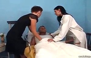 Dries is in hospital feeling exextremely ill. Nothing can make him feel better. Well... nothing? Maybe two horny nurses to cheer him up a little? Well, this twosome works better than any medication: Soon Dries is up and fucking again, filling both assholes with his dick!