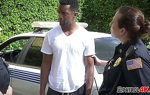 Hot milf dressed as police officers decide to arrest a black dude just to suck his black big cock.