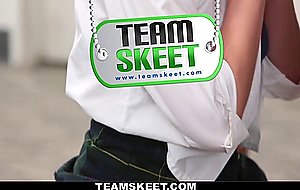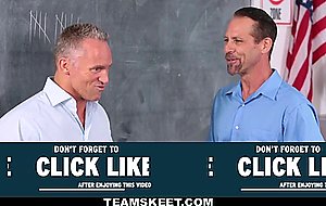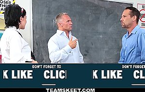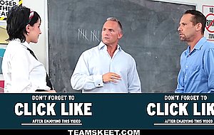 Dazzling sexy schoolgirl Allora Ashlyn gets her pussy pounded by two of her teachers huge cocks inside the classroom.