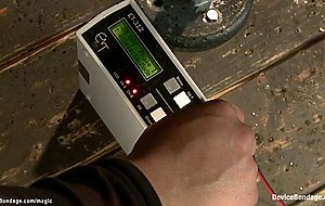 5:00Gagged bound big boobs MILF slave Ariel X straddled wooden peak gets pussy vibed then bound in metal device pussy plugged with wire sex toy by master Orlando